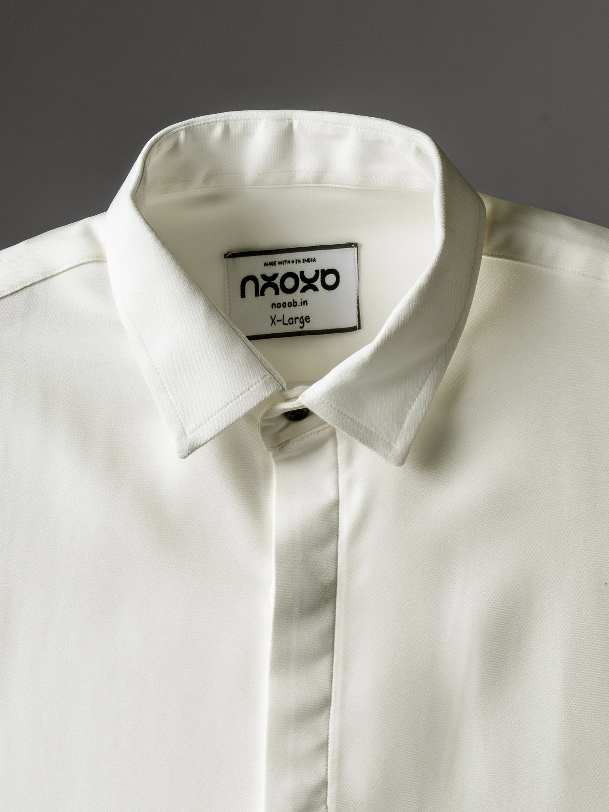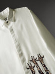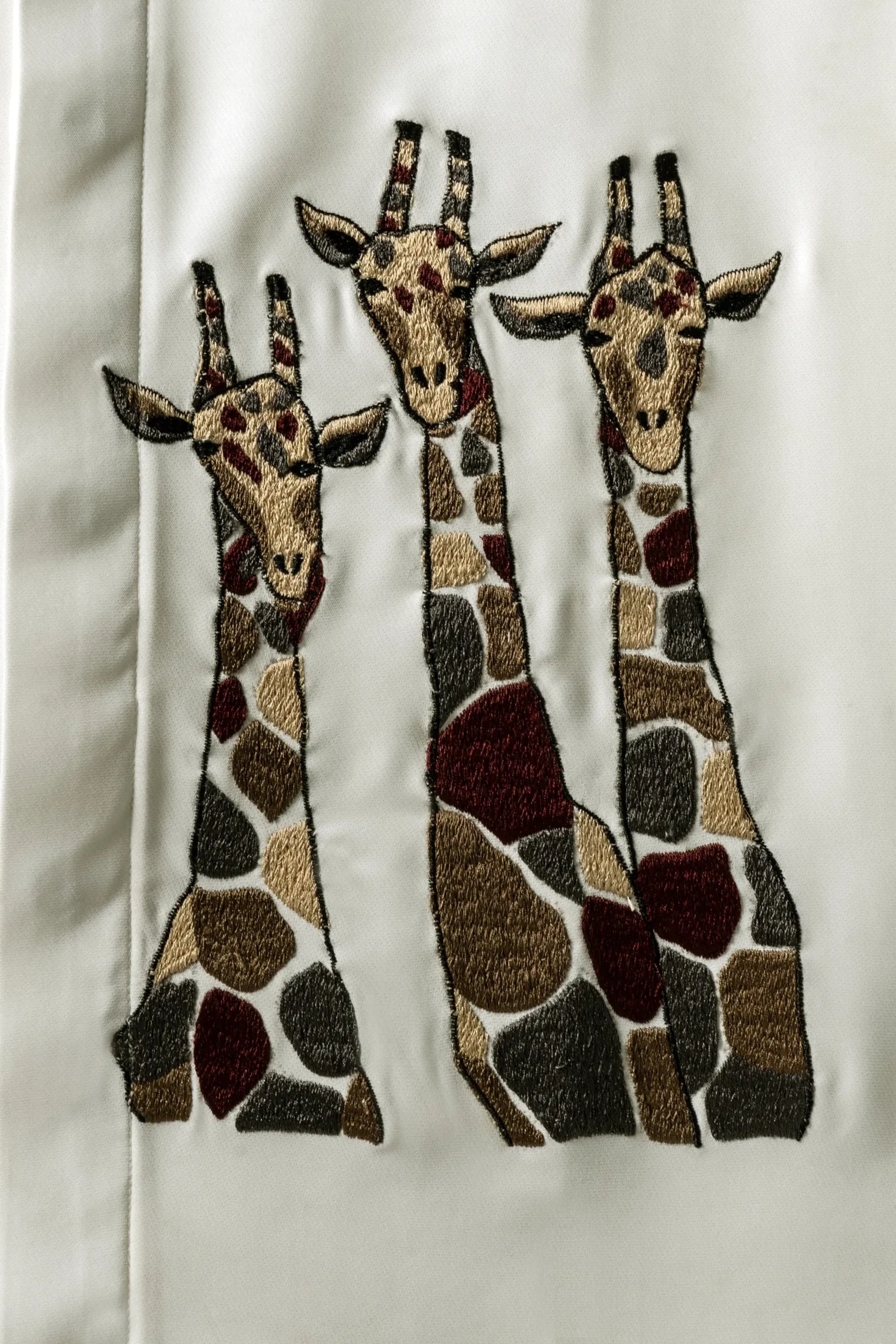 A pristine cream shirt adorned with hand-embroidered giraffes along the hem — symbolizing grace, vision, and the quiet strength of those who rise above.