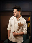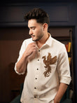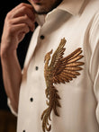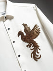 This phoenix embroidered shirt captures the power of renewal and unbreakable will. Set against a refined white base, a hand-embroidered bronze phoenix takes flight across the chest, its wings and flowing tail symbolizing rebirth, immortality, and strength earned through transformation. The artwork feels deliberate and commanding, making this a premium white shirt designed for presence, not excess.