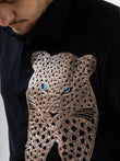 Hand-embroidered panther motif crafted with beadwork and piercing blue eyes for hyper-focused intensity