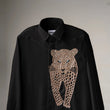 Blue Stare is presence without announcement. Set in deep black, a hand-embroidered panther emerges through precise beadwork, its electric blue eyes cutting through the darkness with unblinking intensity. The contrast is deliberate and controlled, shaping this piece into a panther embroidered black shirt that speaks through stillness rather than noise.