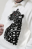 Crimson Prowl captures the beauty of restraint and the power of what remains unsaid. A sculptural black panther, hand-embroidered with cutout detailing, prowls across a clean white canvas — its blood-red eyes locked in silent defiance. This isn’t just a shirt, it’s a portrait of control, focus, and the kind of strength that doesn’t raise its voice.