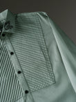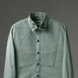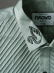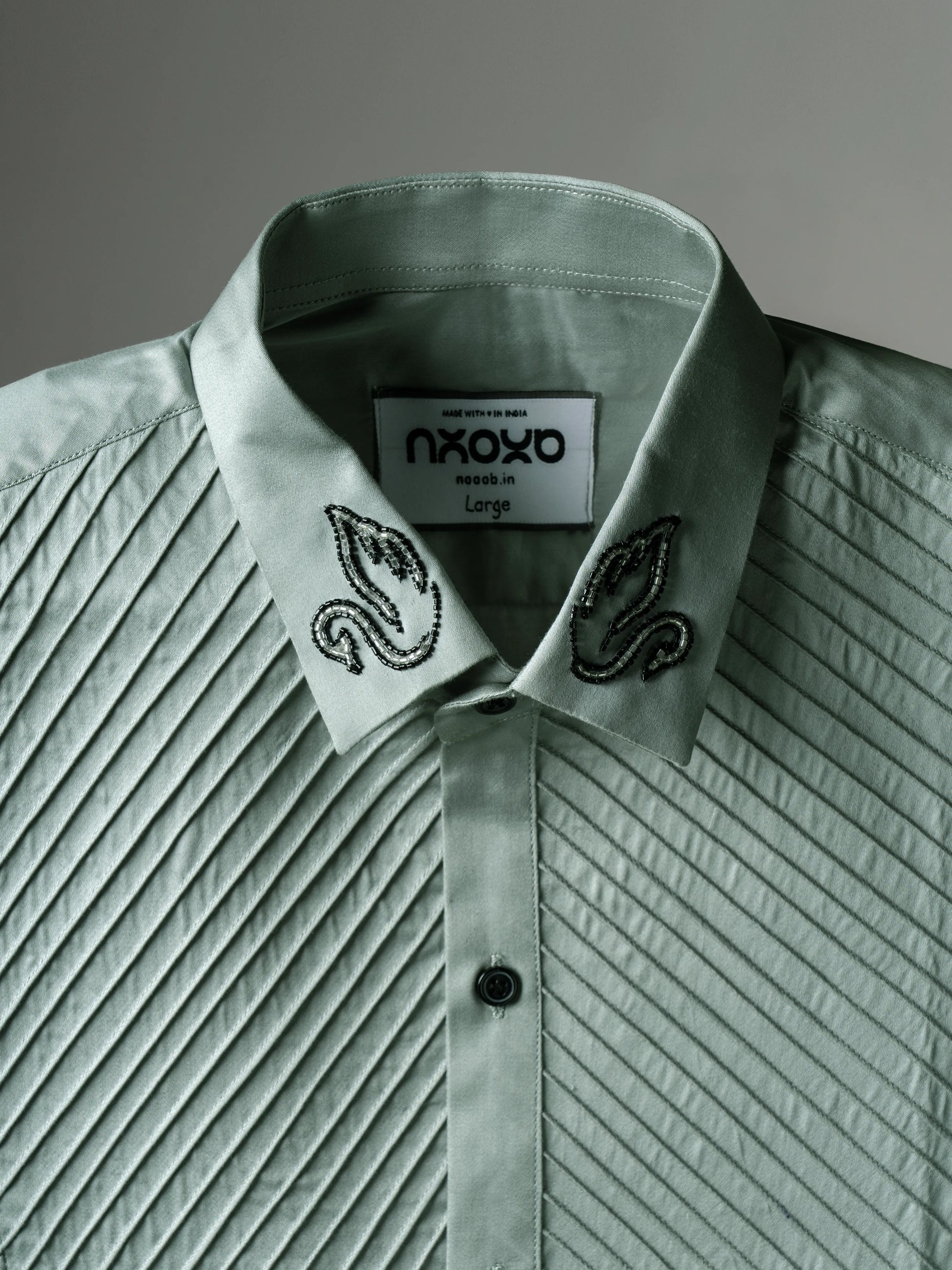 A sage-green shirt featuring sculpted diagonal paneling and twin snake embroideries on the collar — symbolizing allure, wisdom, and the timeless duality of calm and temptation.