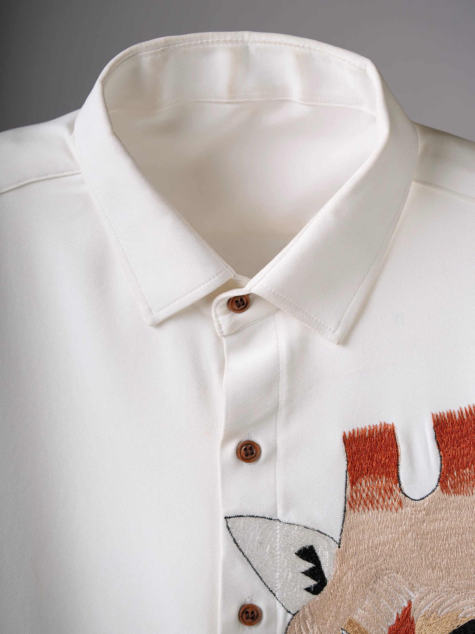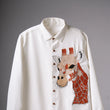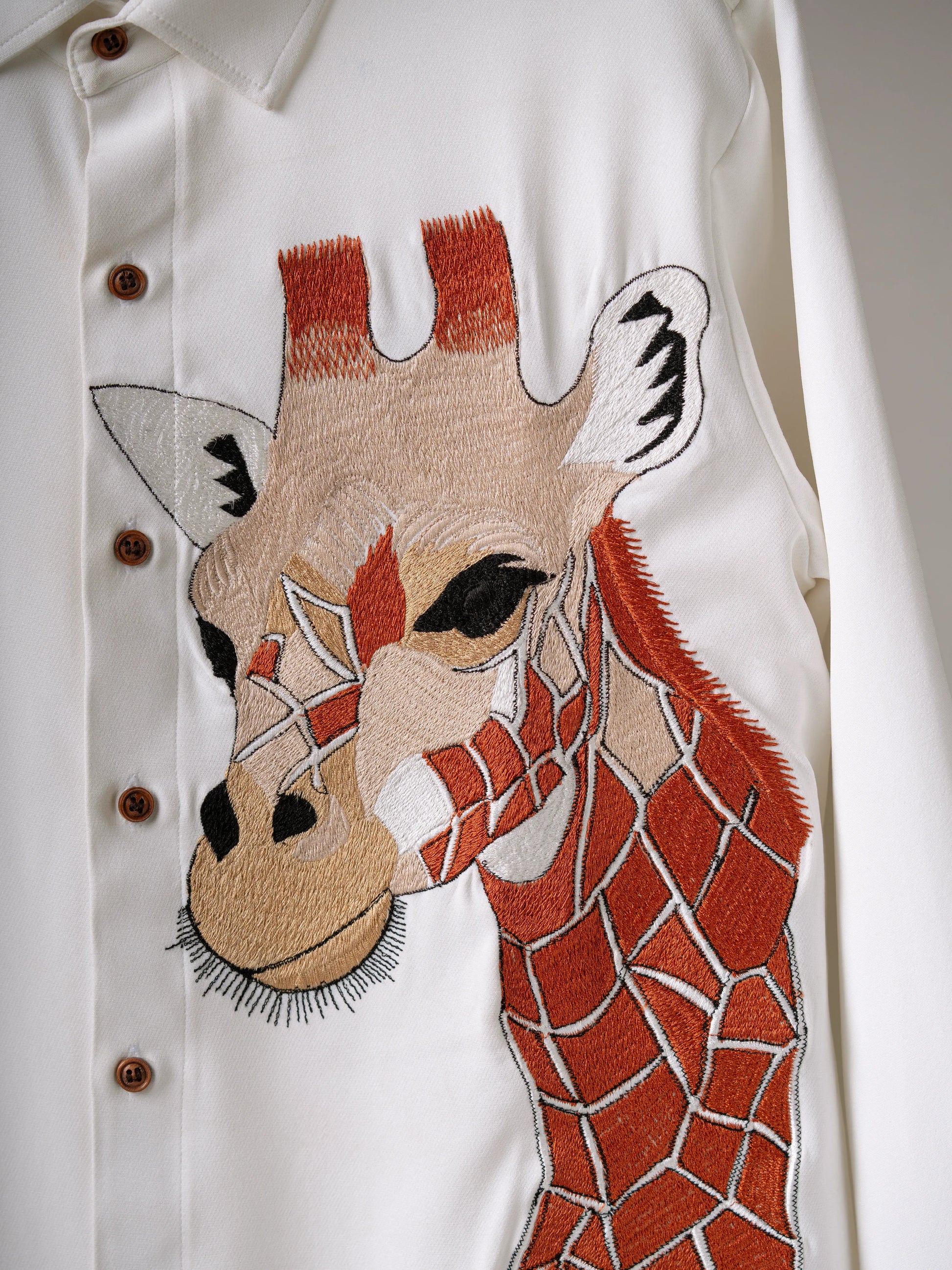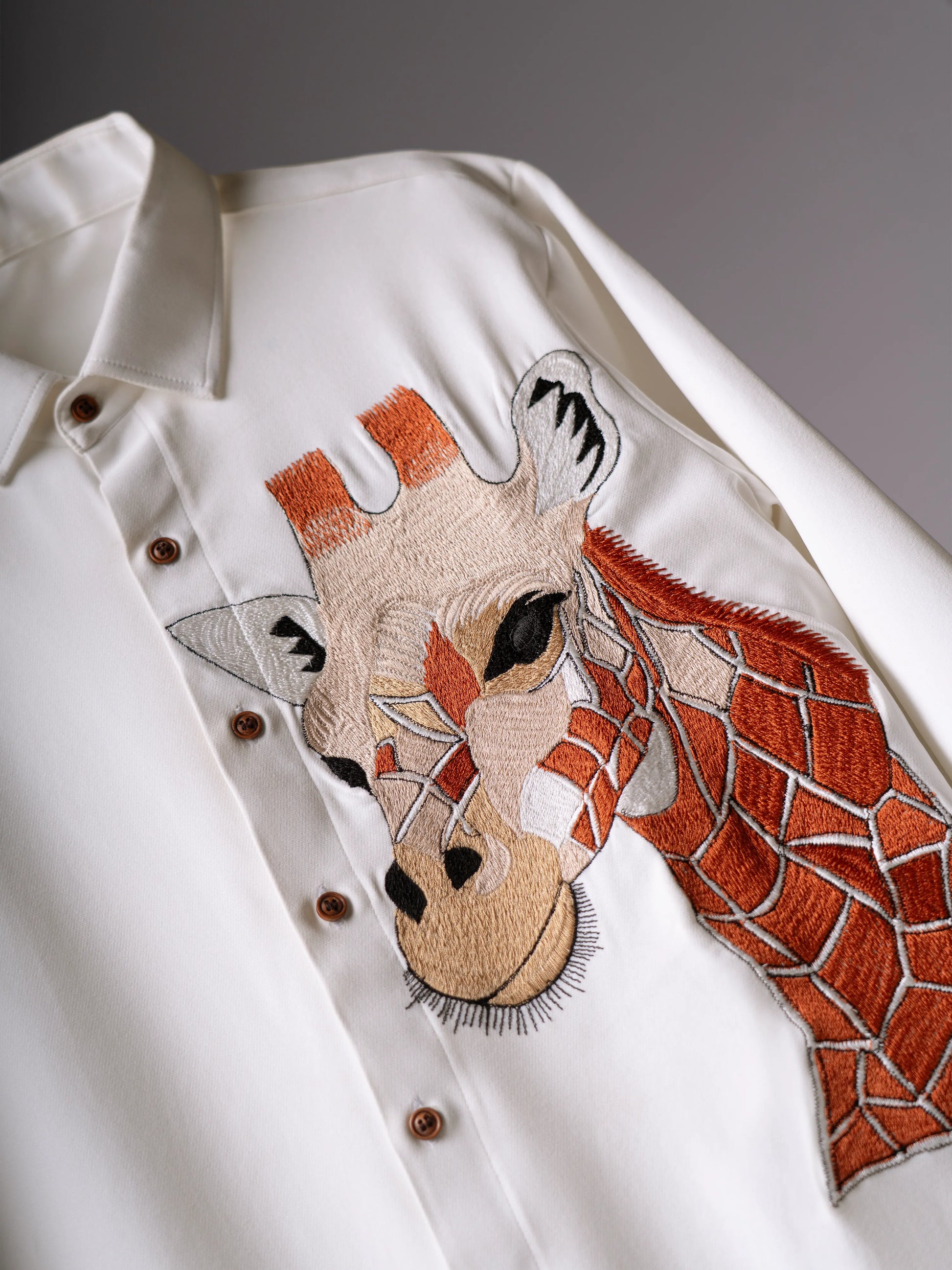 Grace in height, detail in design. Highground is cut from crisp ivory and elevated with an intricately embroidered giraffe — geometric, expressive, and unexpected. It’s a quiet flex for the ones who see above the noise.