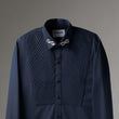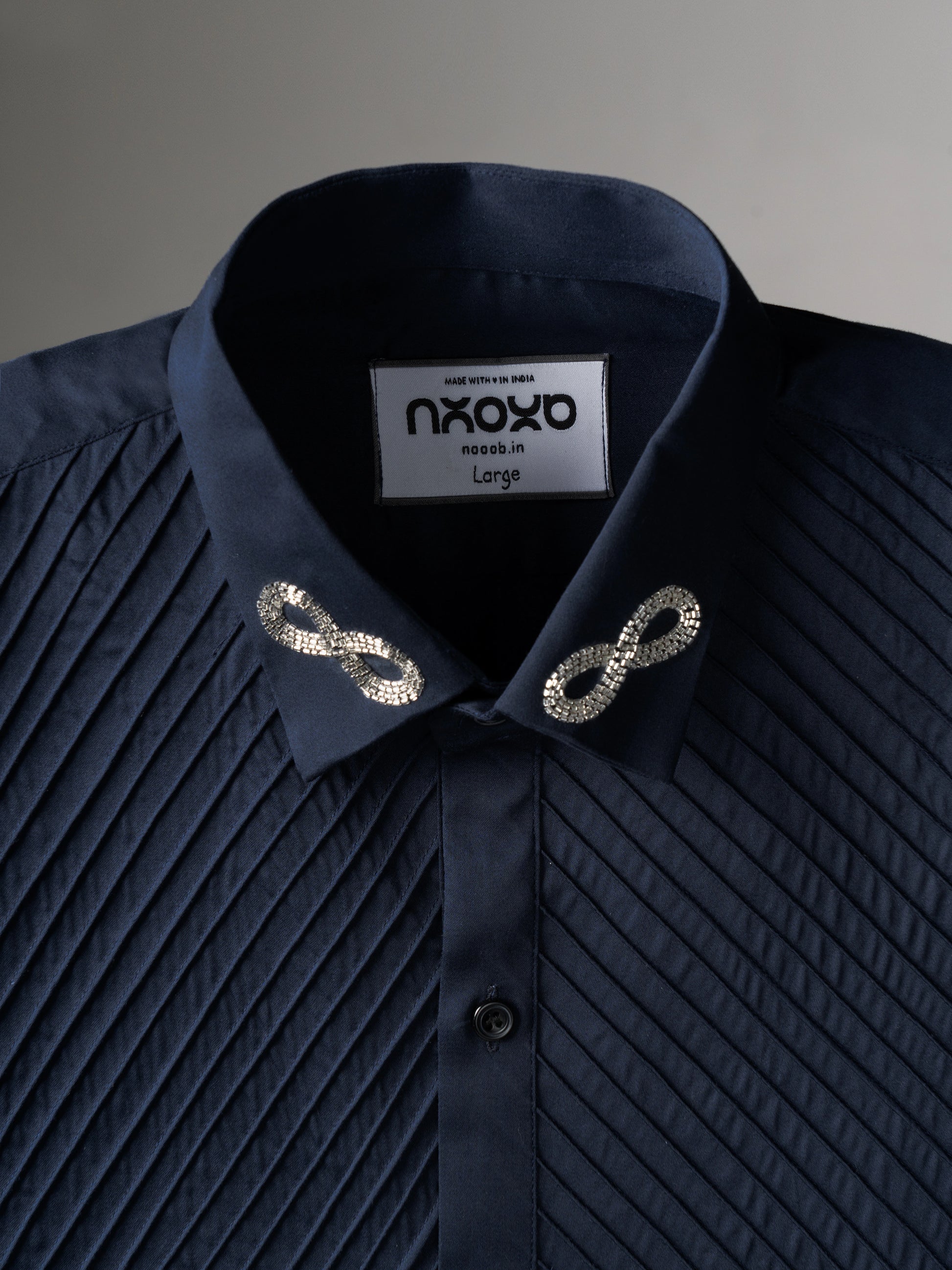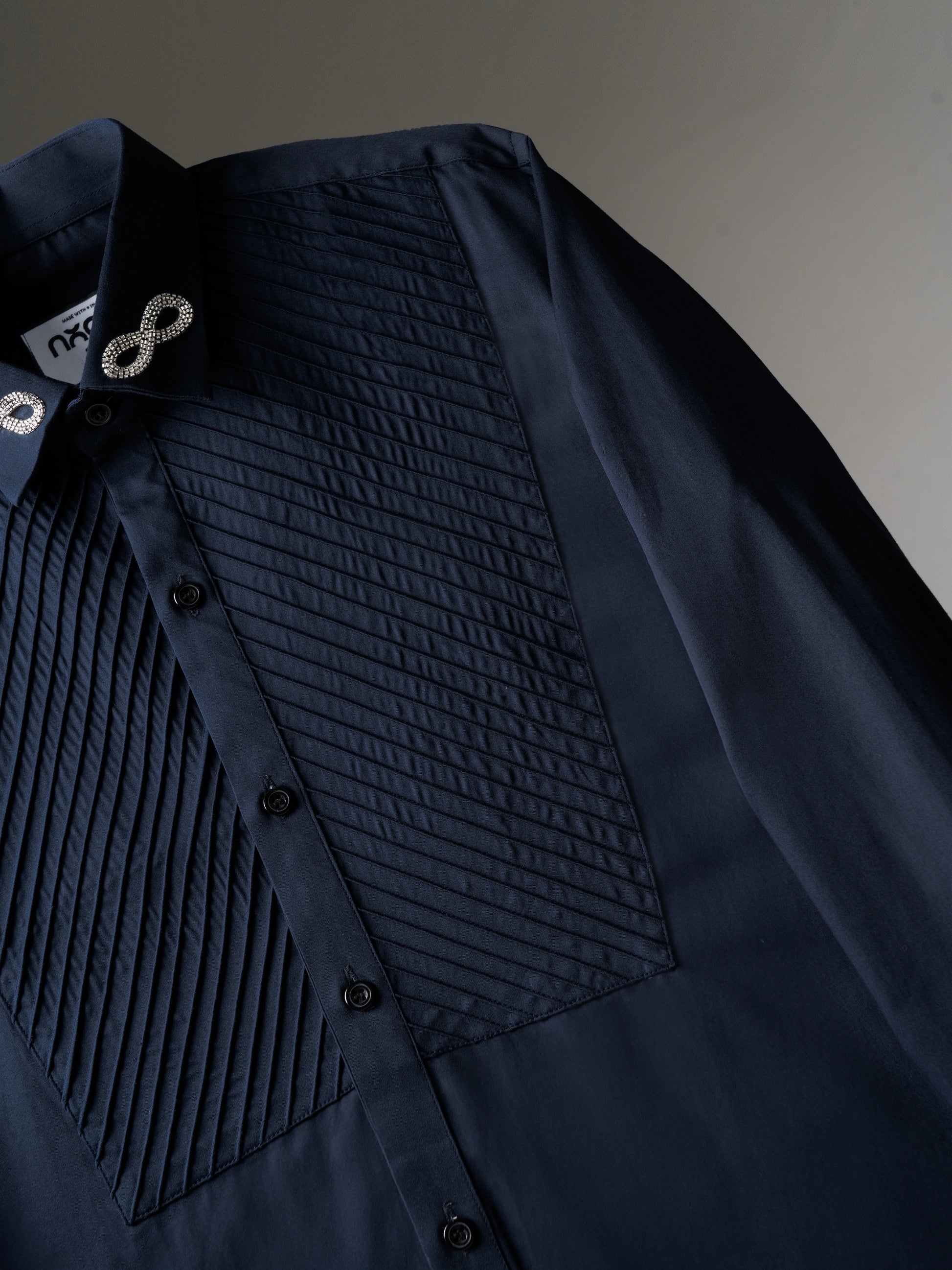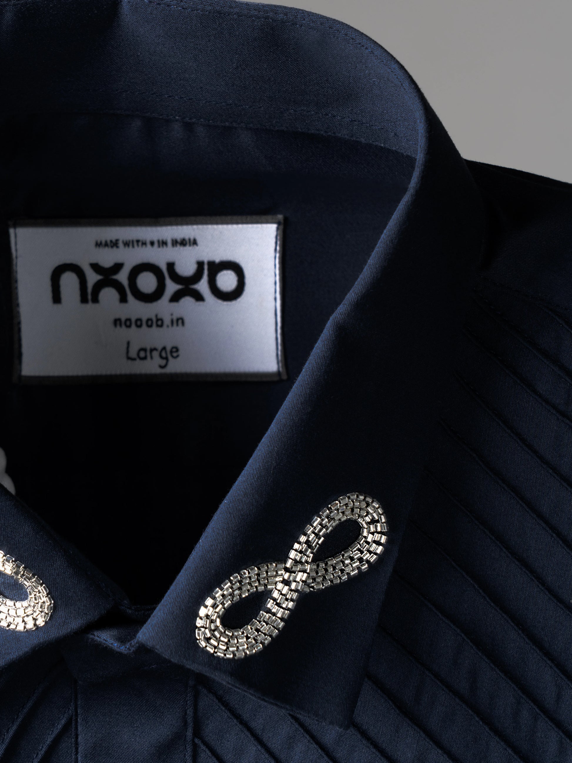 A deep navy shirt defined by precise diagonal paneling and crystal-embellished infinity motifs on the collar — symbolizing clarity, continuity, and quiet brilliance.