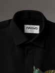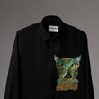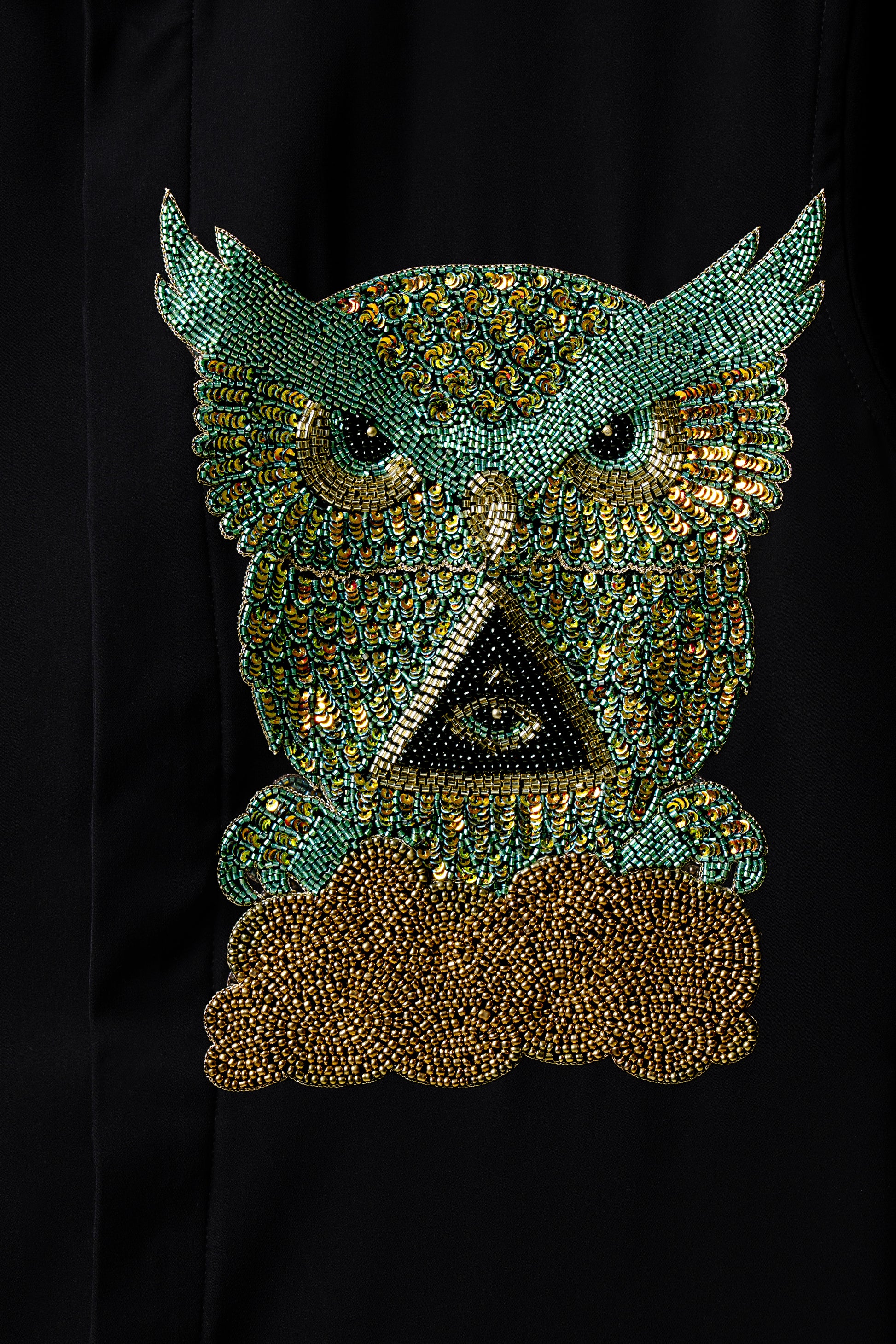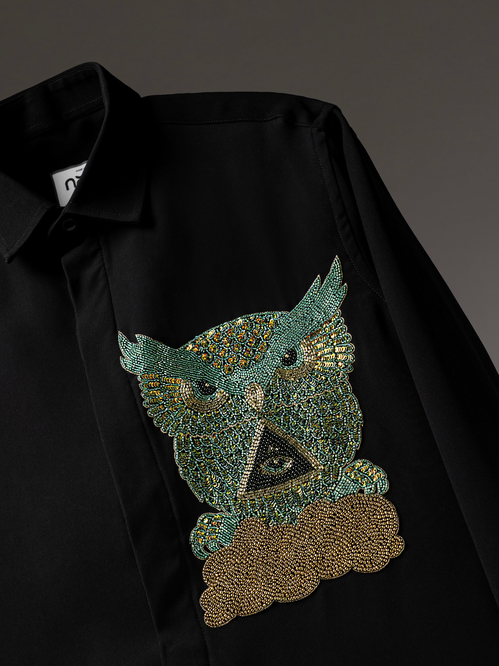 A commanding black shirt featuring a hand-embroidered owl motif — a symbol of wisdom and night vision. The intricate detailing in emerald, gold, and bronze beads creates a striking contrast, making this piece both mysterious and magnetic.