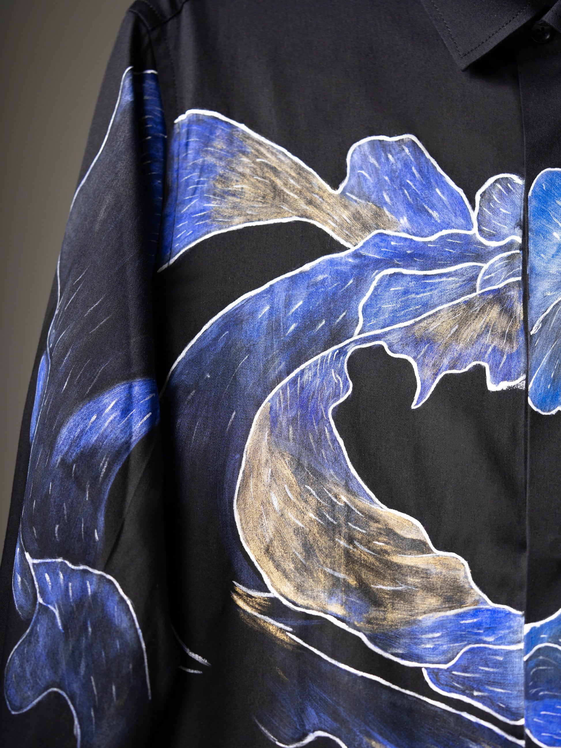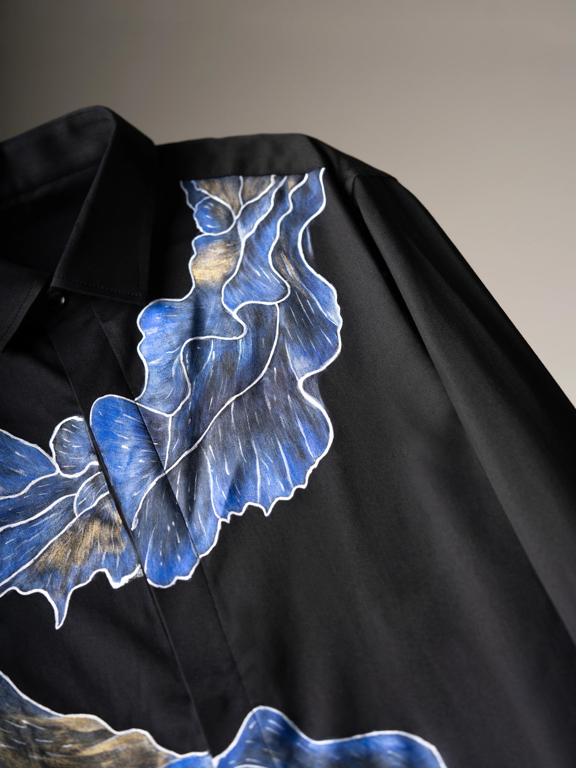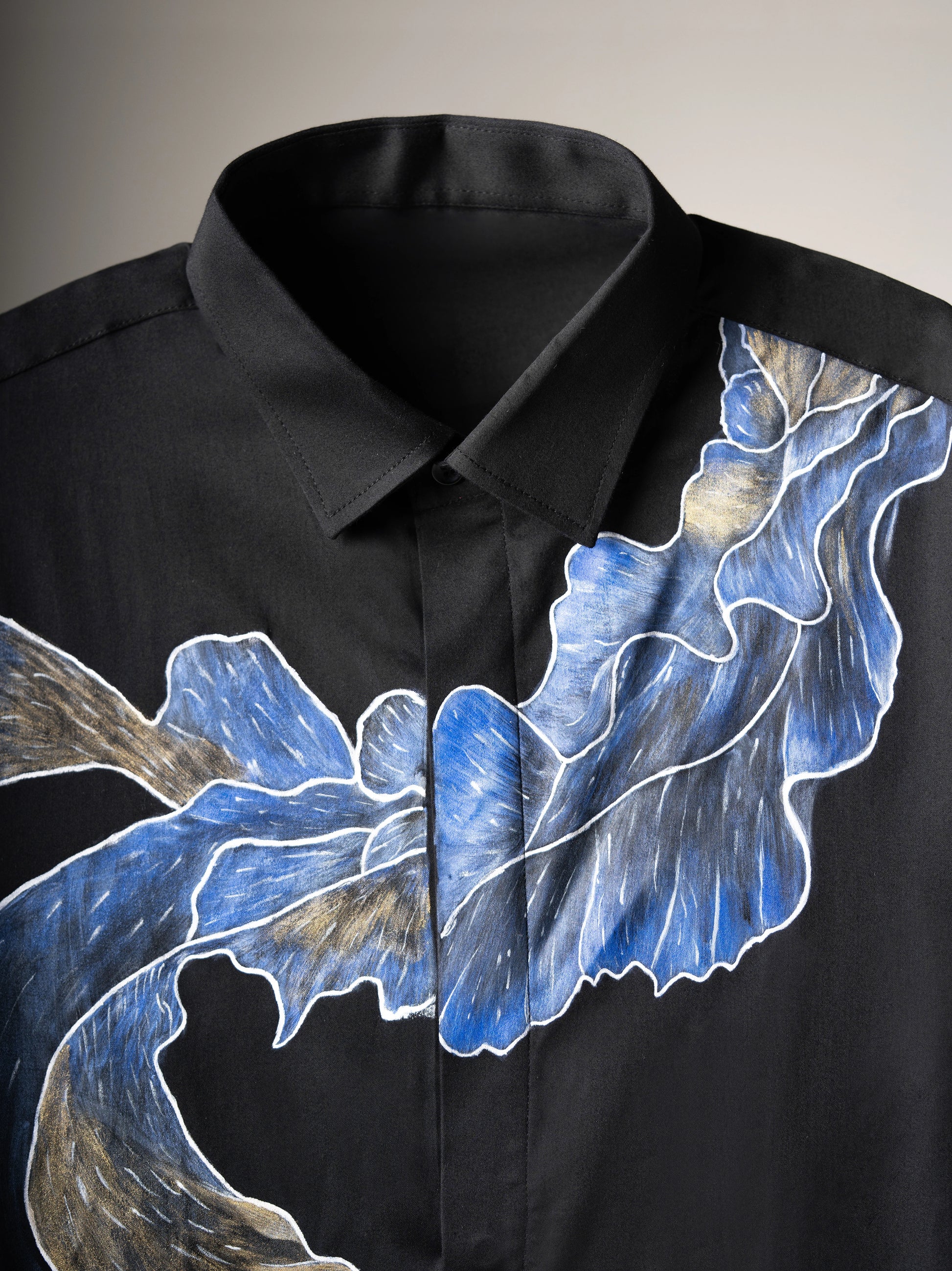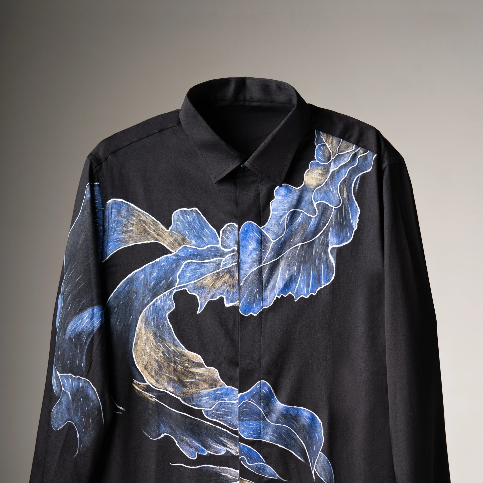 Deep Current flows like instinct — untamed, intuitive, and bold. Hand-painted oceanic strokes swirl across jet black, tracing movement without destination. This shirt is less about what’s seen, more about what’s felt — made for minds that move in silence and strike in style.