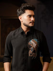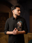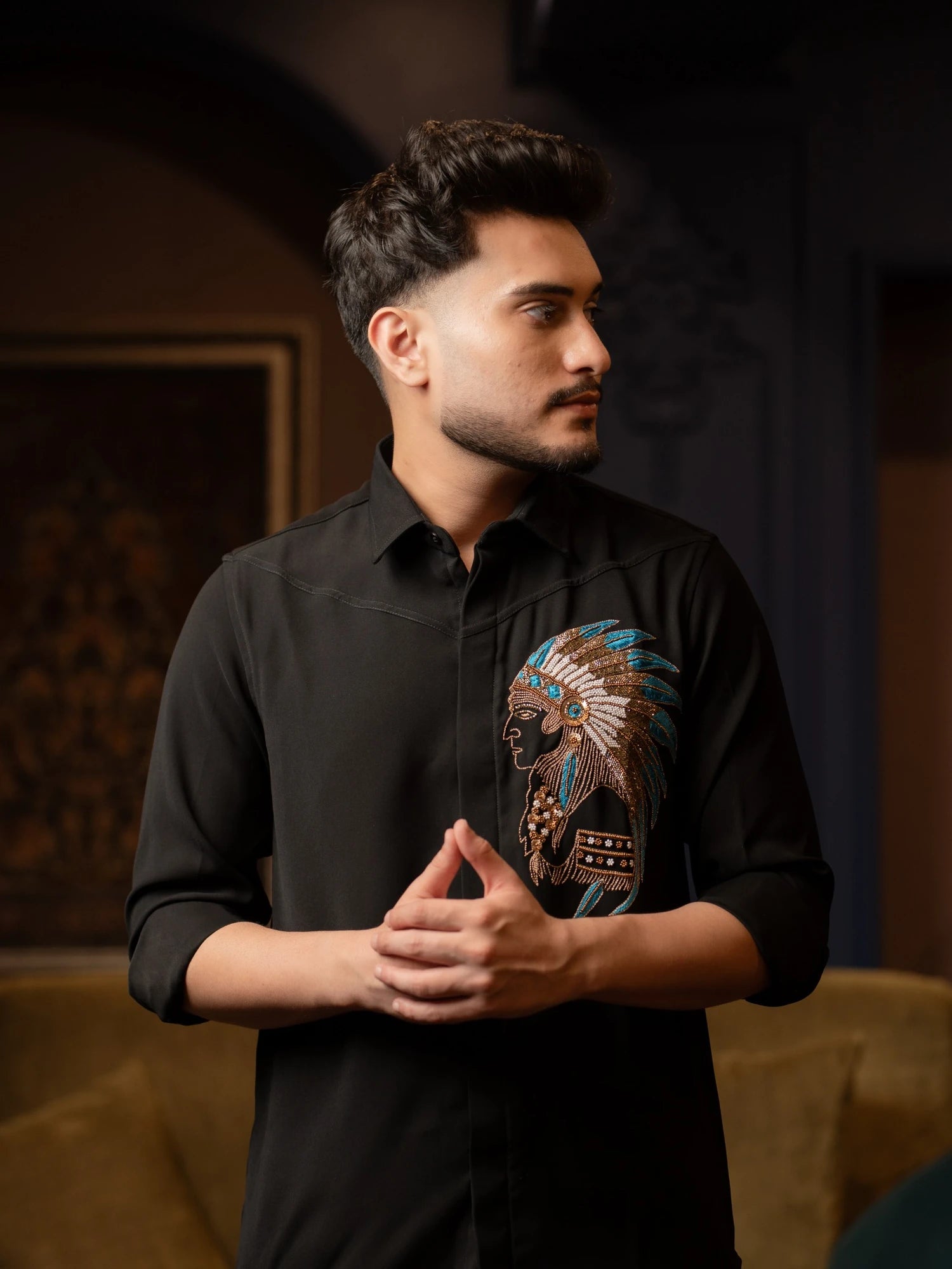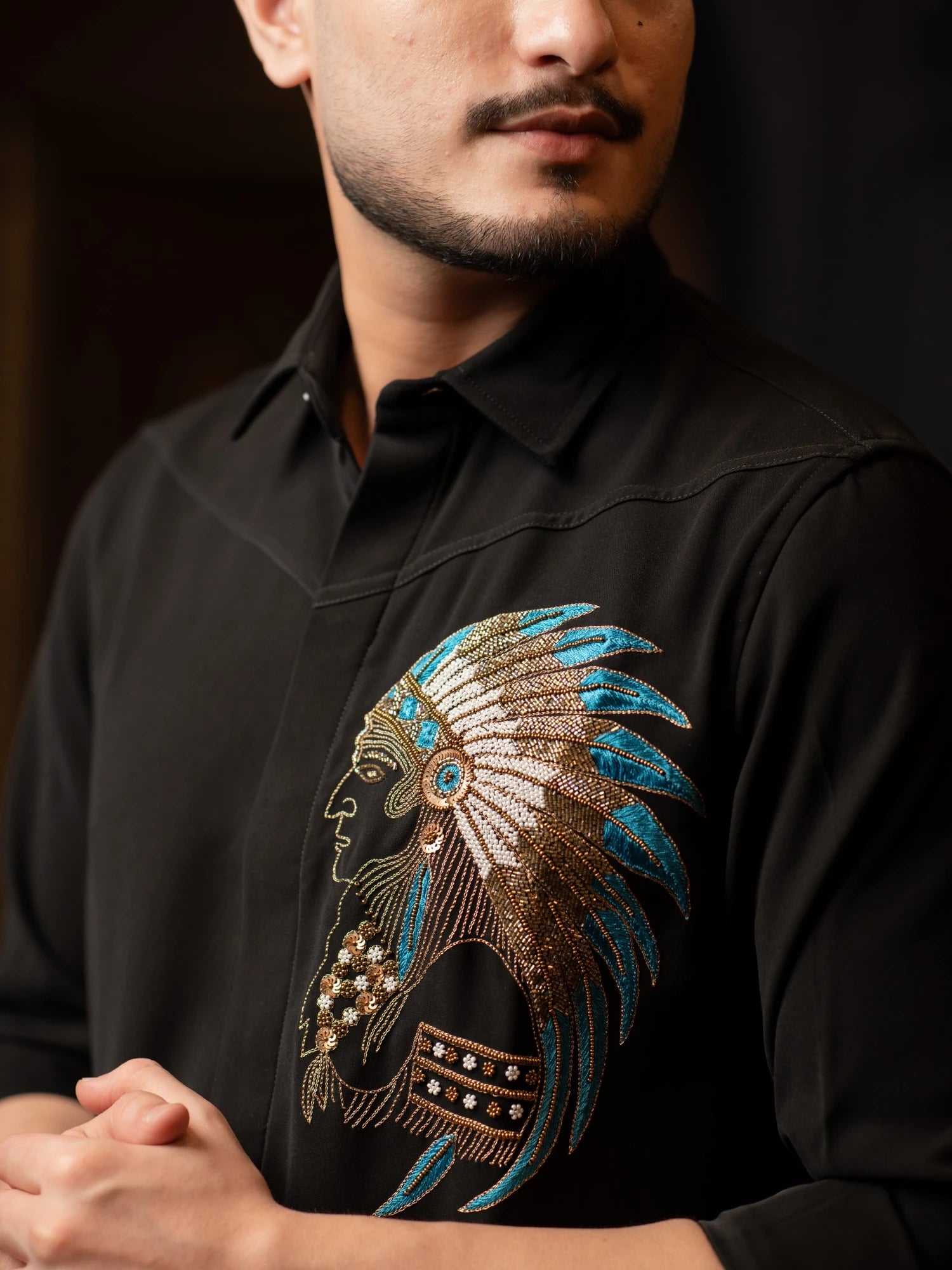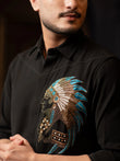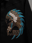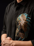 A commanding black shirt with a hand-embroidered tribal chief motif in bronze and turquoise beadwork — embodying authority, heritage, and the mystique of the night.