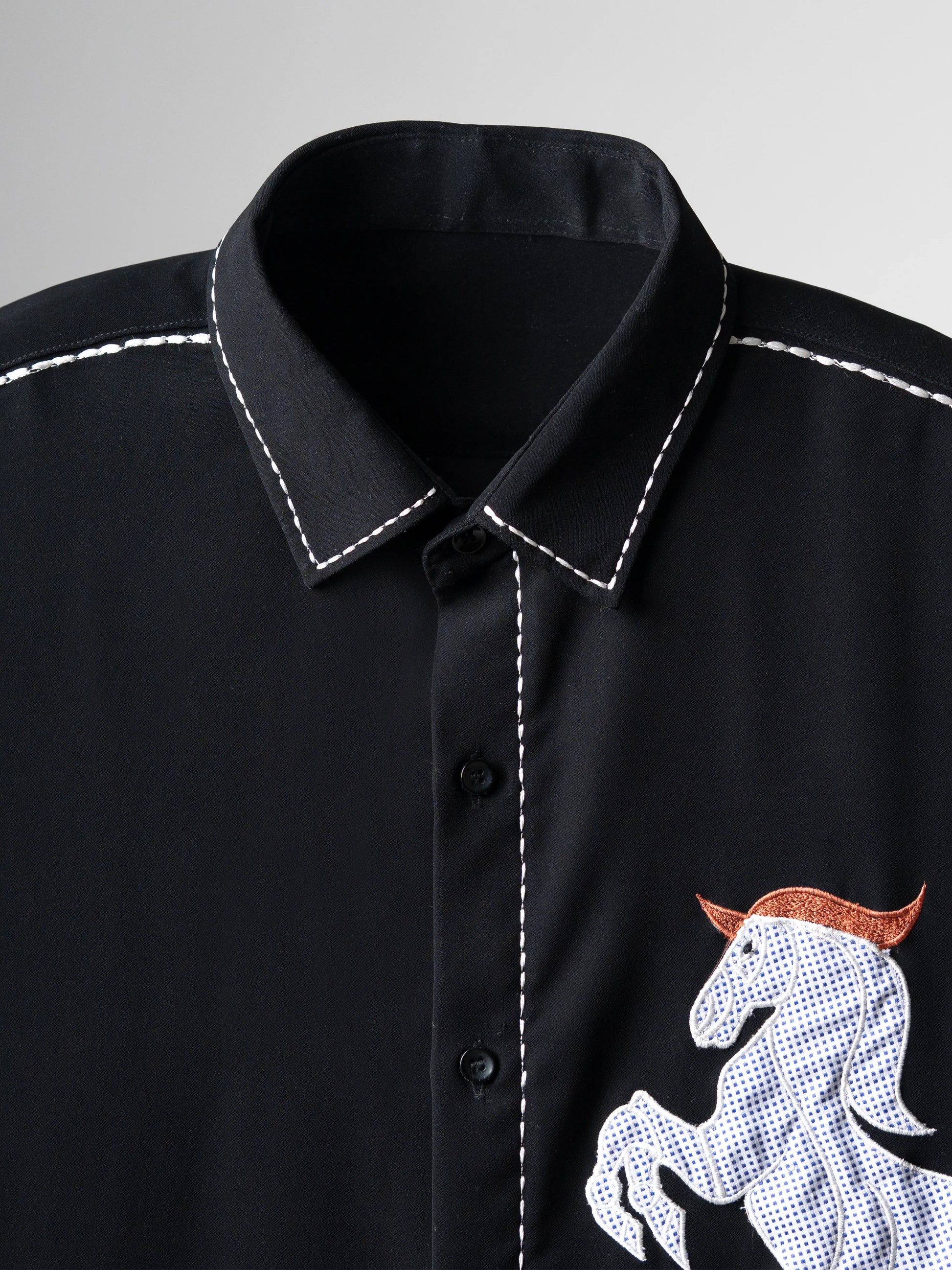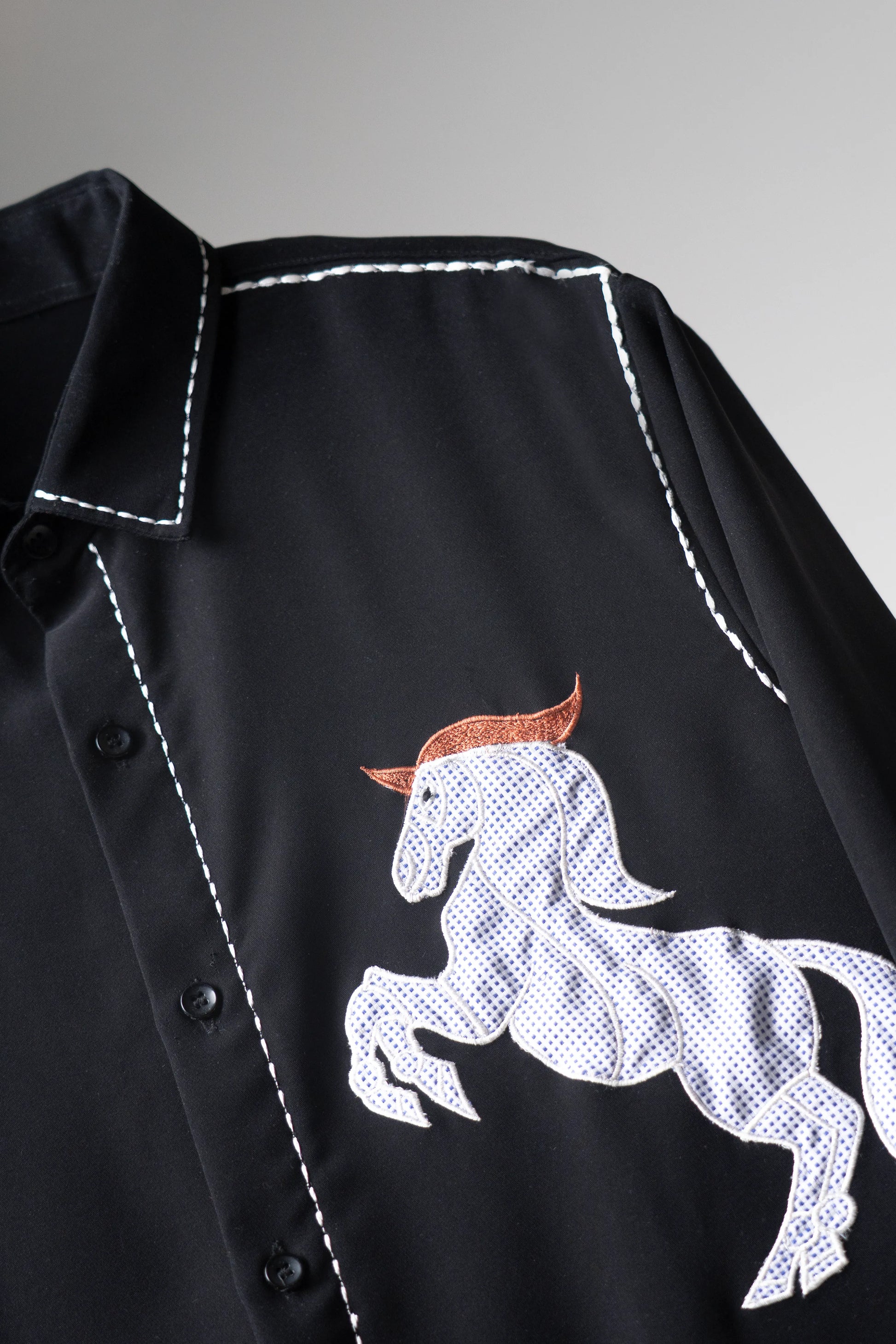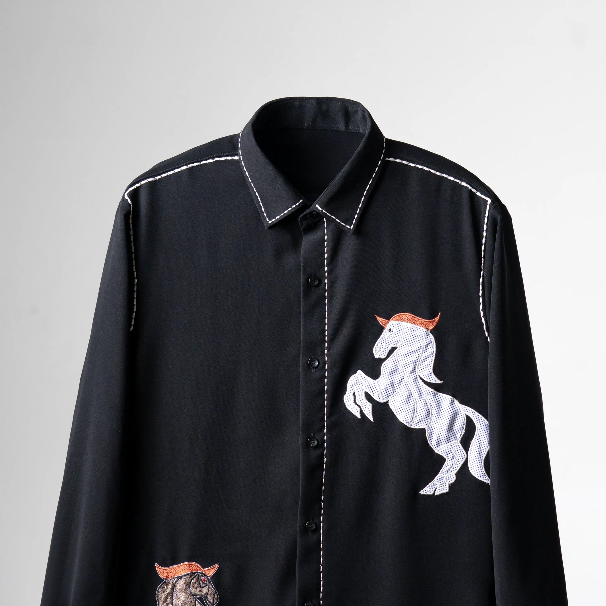 Shadow Parade steps outside the lines with embroidered stallions — one light, one dark — both crowned in a striking red. Detailed contrast stitching and hidden jacquard trims lend layers to this midnight shirt. It’s tailored for the ones who carry duality well: silent but never soft.