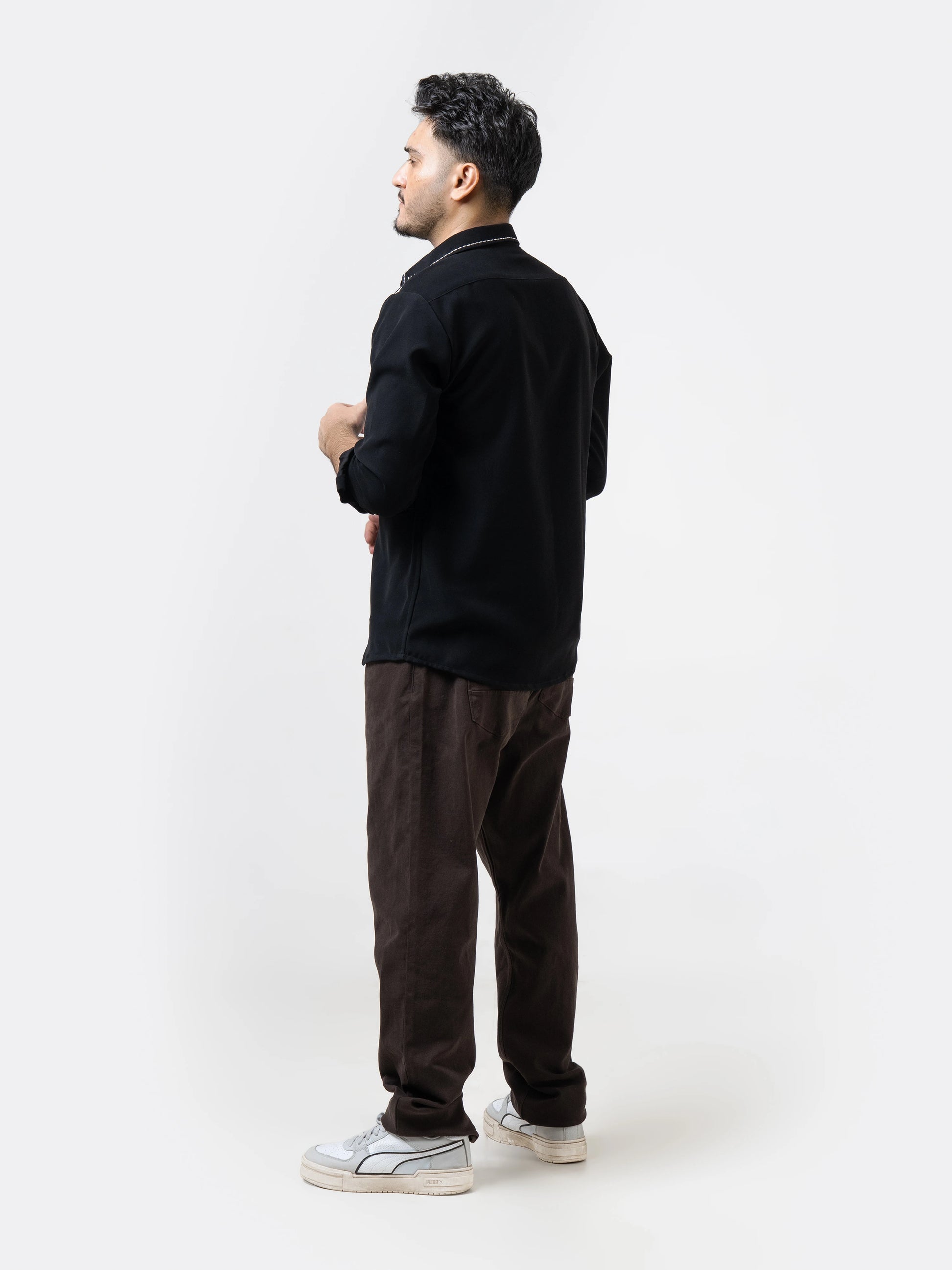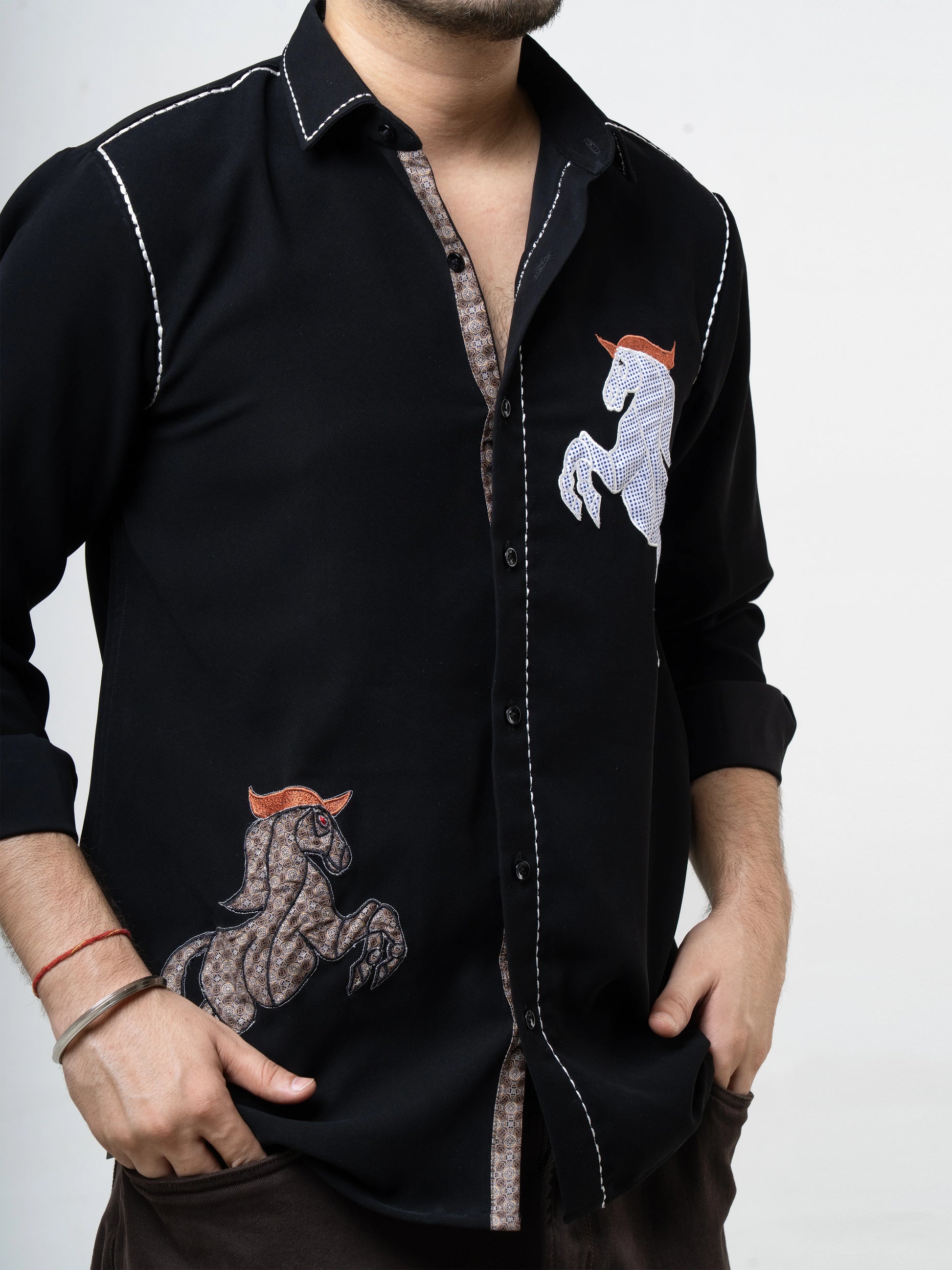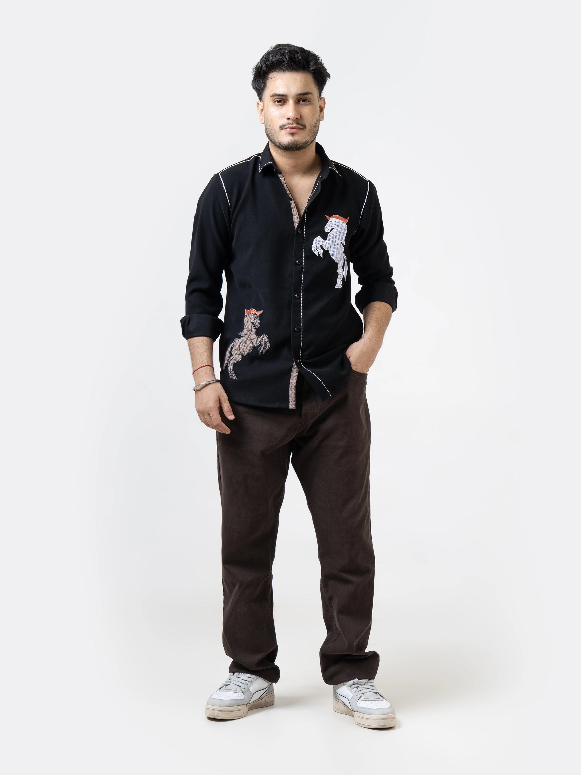Shadow Parade steps outside the lines with embroidered stallions — one light, one dark — both crowned in a striking red. Detailed contrast stitching and hidden jacquard trims lend layers to this midnight shirt. It’s tailored for the ones who carry duality well: silent but never soft.