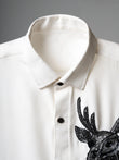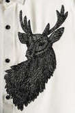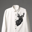 Silent Hunt Deer embroidered shirt draws inspiration from nature’s quiet authority. Set on a pristine white base, a fierce yet graceful deer emerges through intricate hand-beaded embroidery, its bold black detailing creating a striking contrast against the fabric. The composition feels balanced and intentional, making it a white premium shirt that speaks through poise rather than excess.