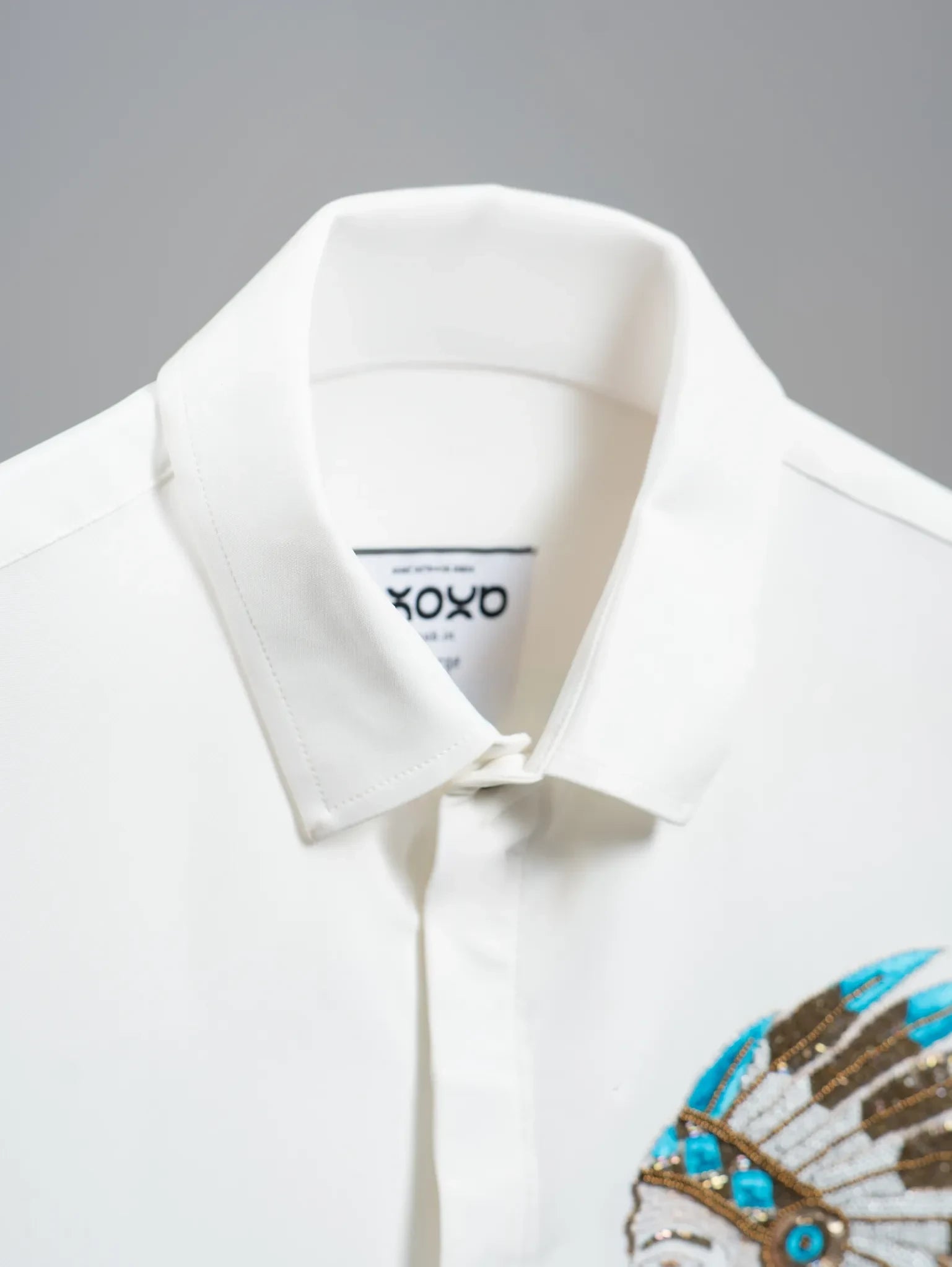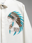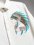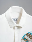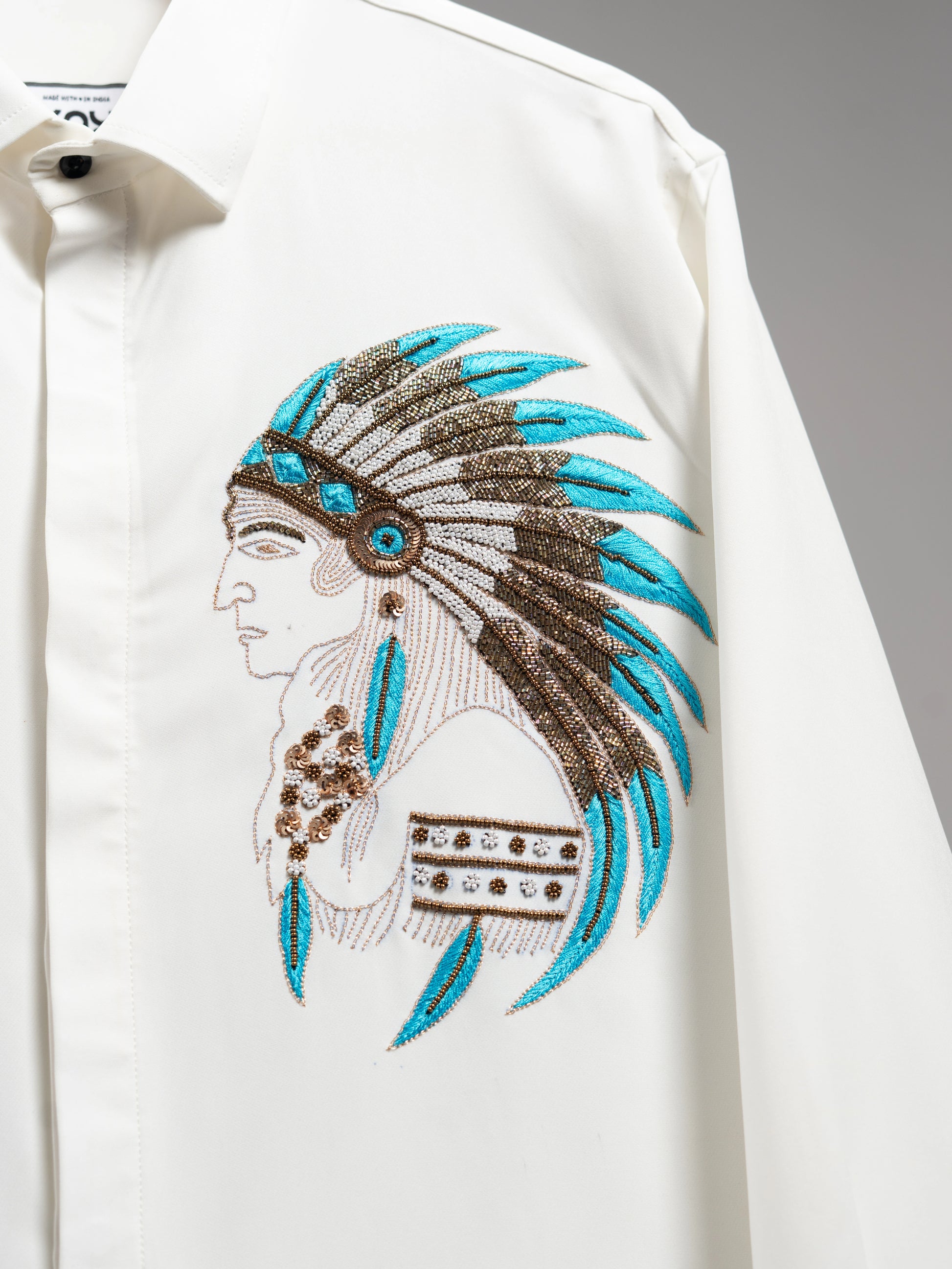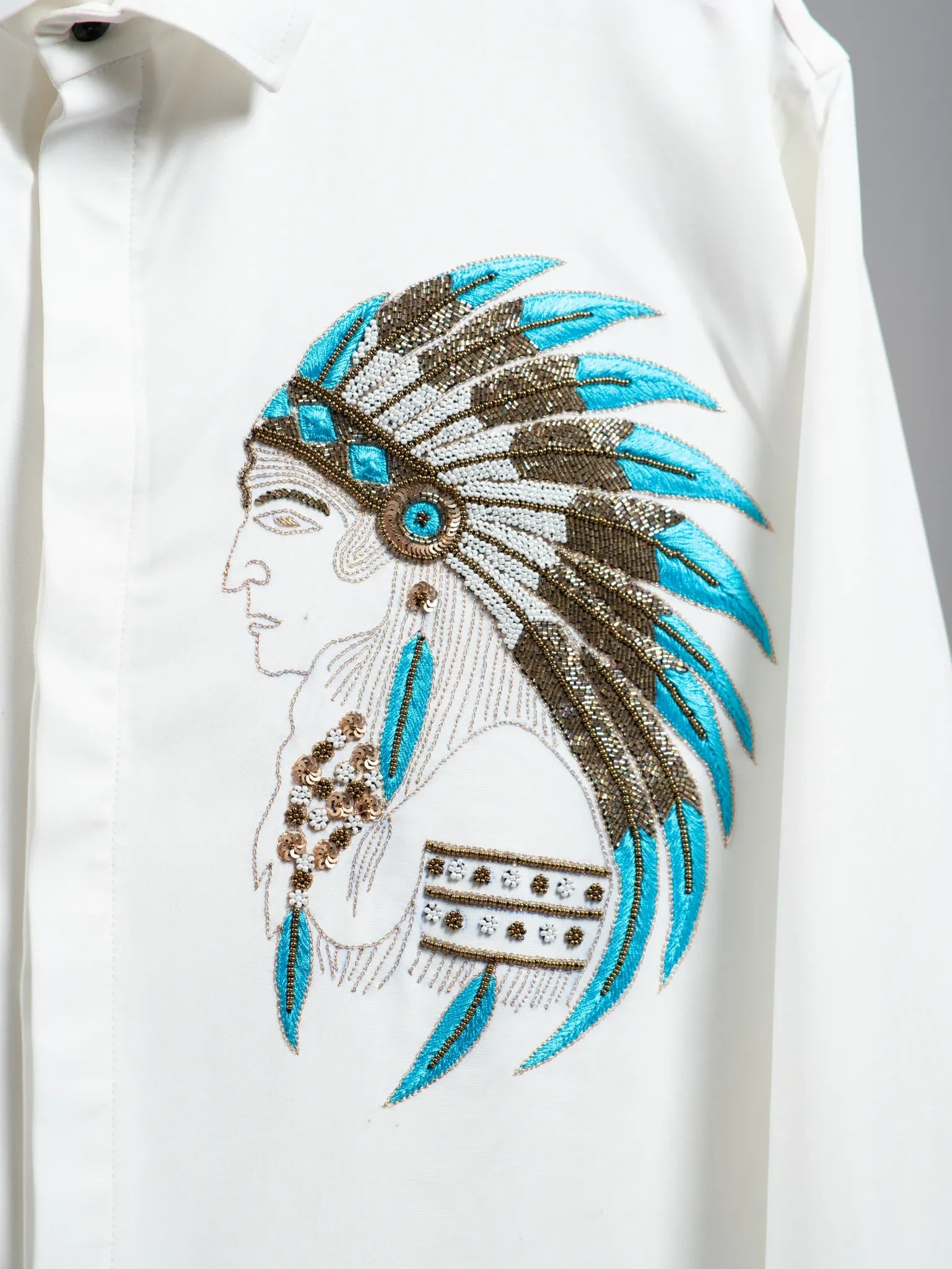 A refined white shirt featuring a hand-embroidered tribal chief motif in bronze and turquoise beadwork — symbolizing leadership, heritage, and timeless strength.