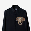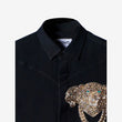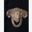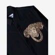 Hand-applied bead embroidery featuring a three-headed leopard motif with chain detailing for depth and dimensional brilliance