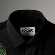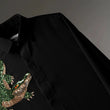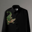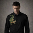 This crocodile embroidered shirt represents strength, patience, and quiet confidence. Crafted on a deep black base, it features a hand-embroidered crocodile in rich emerald green and bronze beadwork. The detailed embroidery adds depth and contrast, giving the shirt a bold yet refined presence.